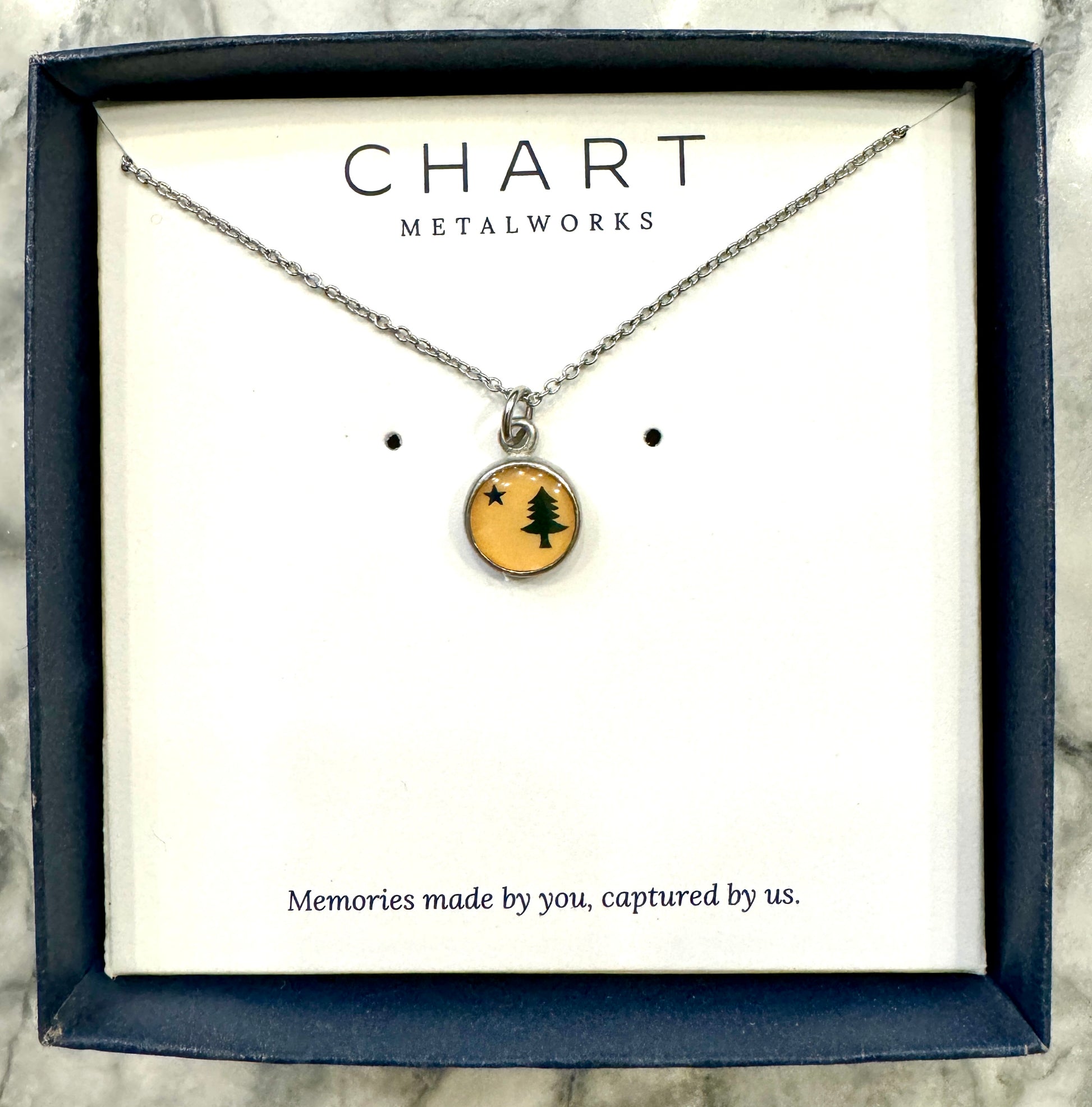 Wear Maine's heritage with this handmade pewter necklace featuring the iconic 1901 Maine Flag design. Crafted by CHART Metalworks, this small yet striking pendant is about the size of a thumbtack, showcasing intricate detail preserved in hand-poured boater's resin. Suspended on an 18-inch chain, this artisan necklace is perfect for Maine enthusiasts or anyone who loves the great state of Maine.